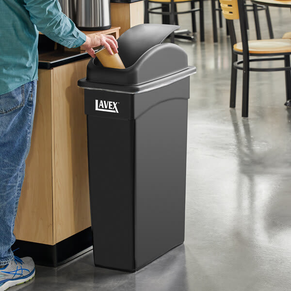 Choosing the right trash can for your facility will be simple with this Lavex black slim trash can. Featuring a slim profile that's great for tight spaces, it is perfect for any location! Place the trash can in spaces along work stations and break rooms. This trash can is also perfect for narrow hallways and in the back of the house at restaurants to collect garbage while remaining out of the footpath.