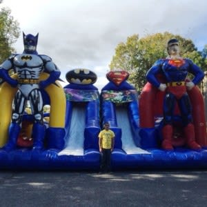 Everyone Loves a challange. Our Duel Lane Superman/Batman Challange Obstacle Course is 60" full of action. Enter the ride, then work your way through vertical and horizontal obstacles, then turn for home on the 12' slide. Have fun competing with your friends or just enjoying the challange of the ride.