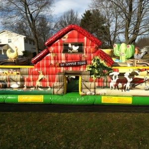 Ninja Jump Farm Town Toddler Playgound. Perfect for children 1-5. Age appropriate jump area, slides, crawl spaces with wonderful fun farm animal graphics. Watch your toddlers have hours of fun.